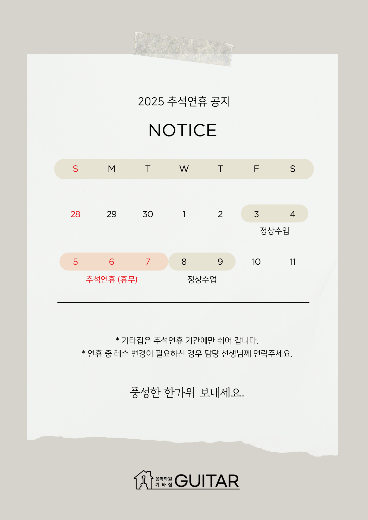 안녕하세요.기타집 추석 명절 연휴 기간 오픈기간 안내 소식입니다.10월 5,6,7일 (추석 명절 3일간) 임시 휴무 입니다.다른 요일은 모두 정상 오픈되어 있으니 이용에 참고 바랍니다.