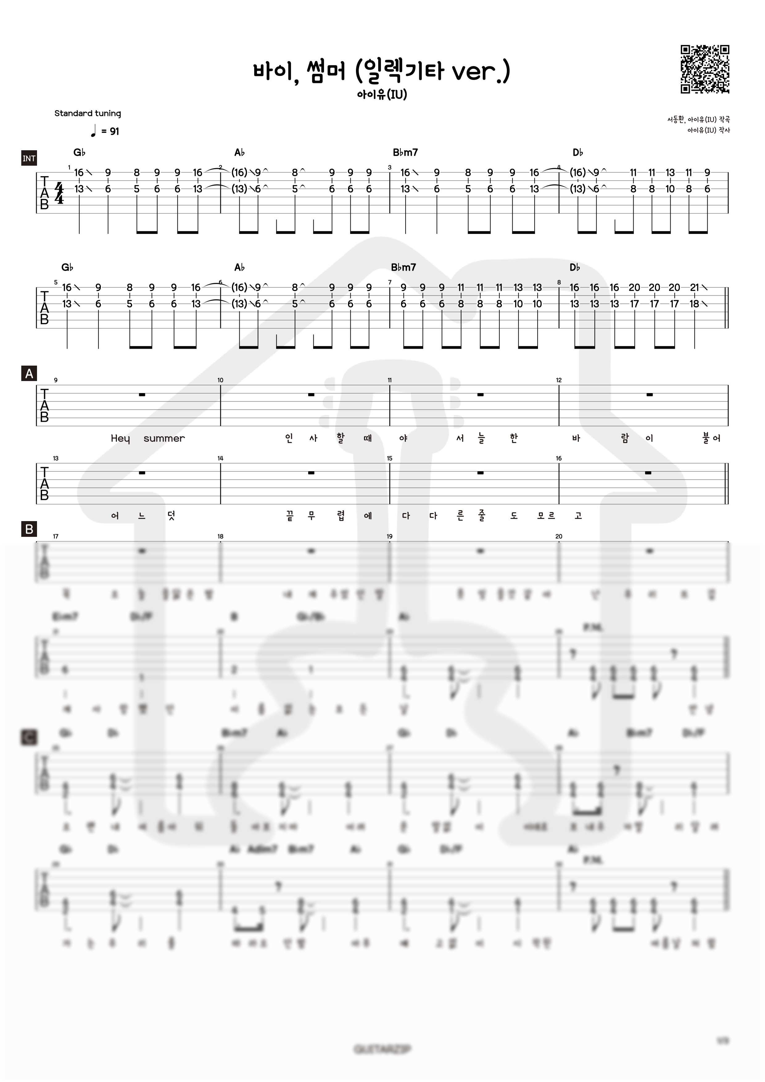 바이, 썸머 - 아이유(IU) 일렉기타 버전 타브 악보 입니다. 즐거운 연주되세요 :)