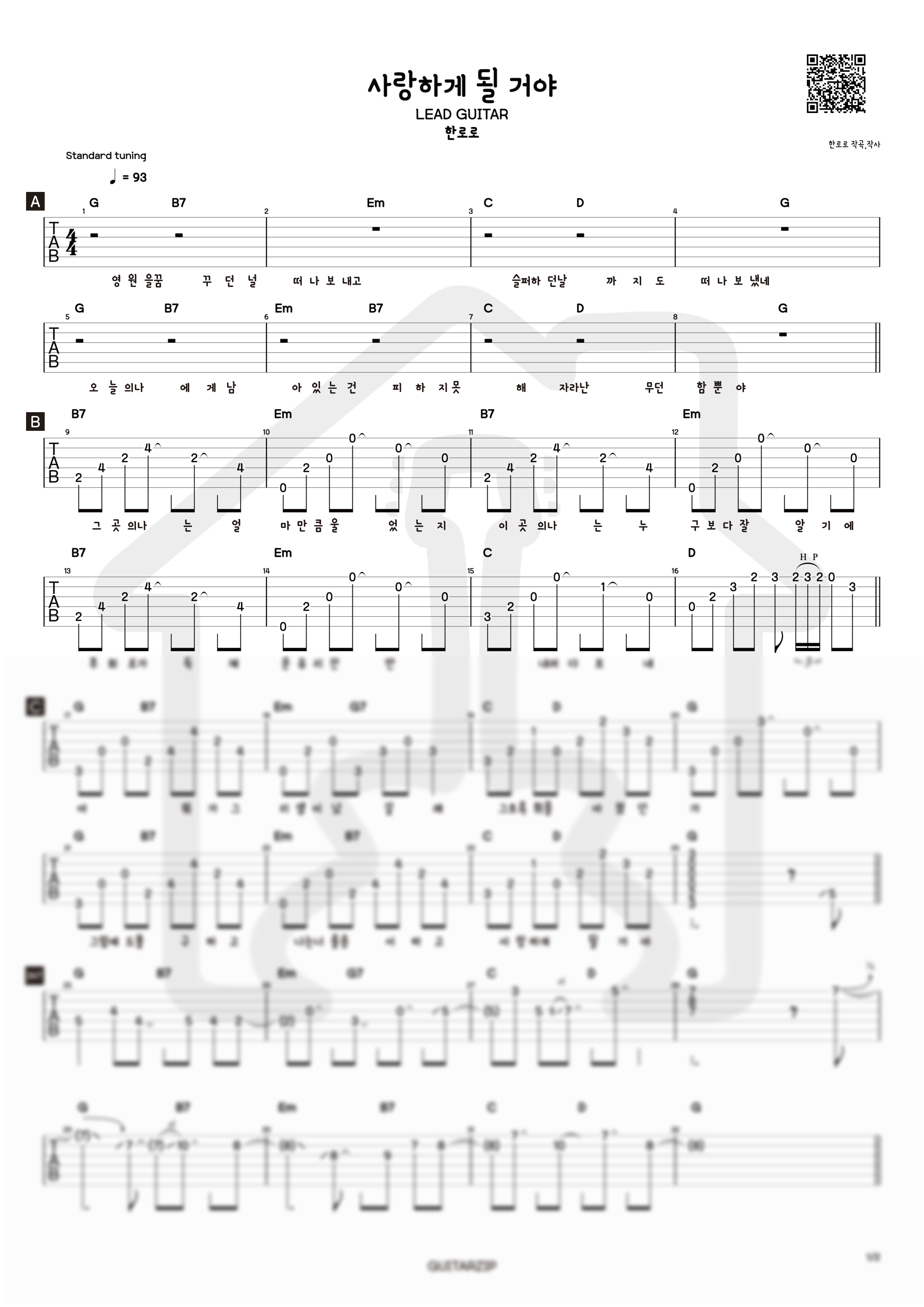 사랑하게 될 거야 - 한로로 (Lead ver.) TAB악보
