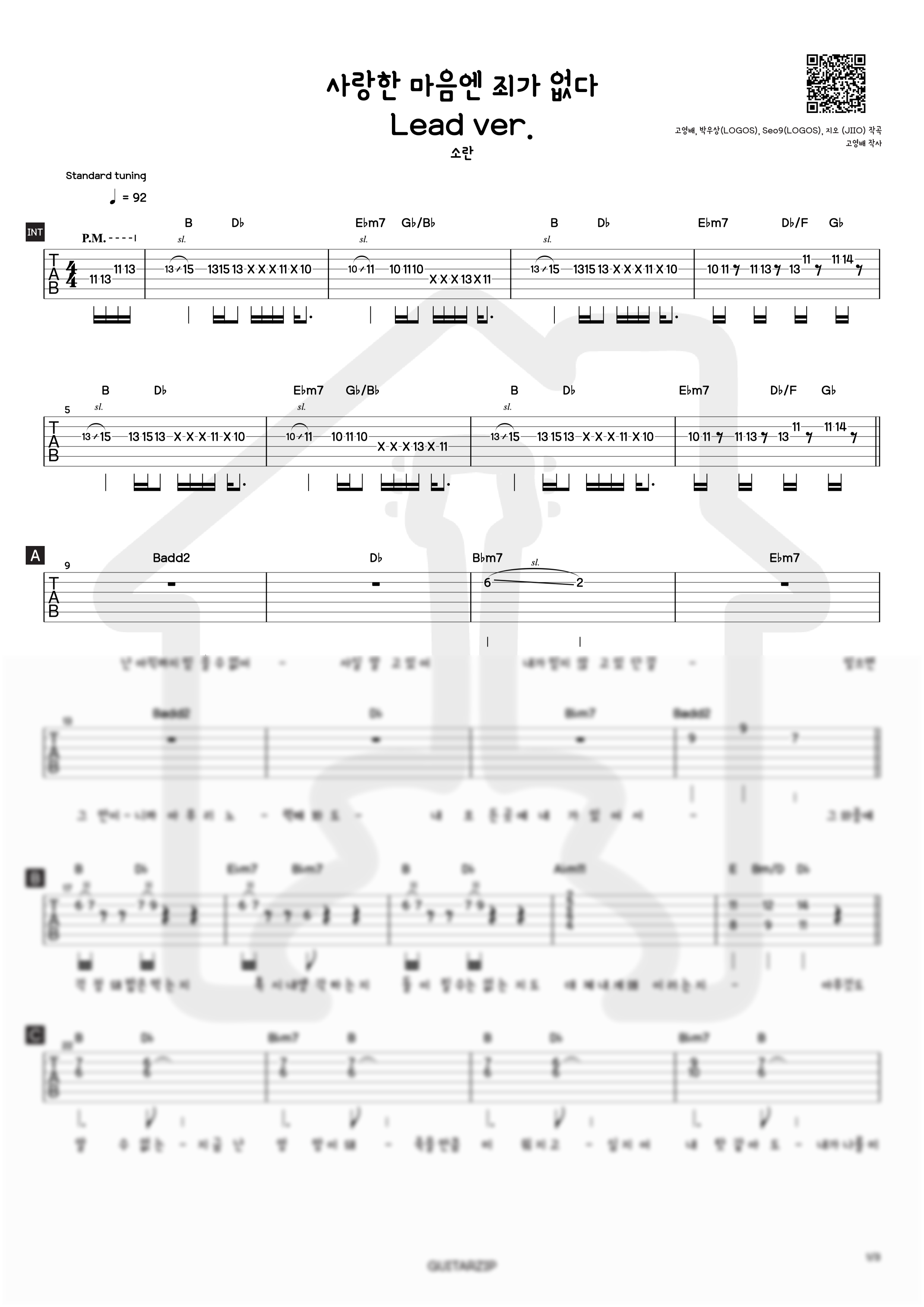 사랑한 마음엔 죄가 없다 - 소란(SORAN) (Lead ver.) TAB악보 입니다.