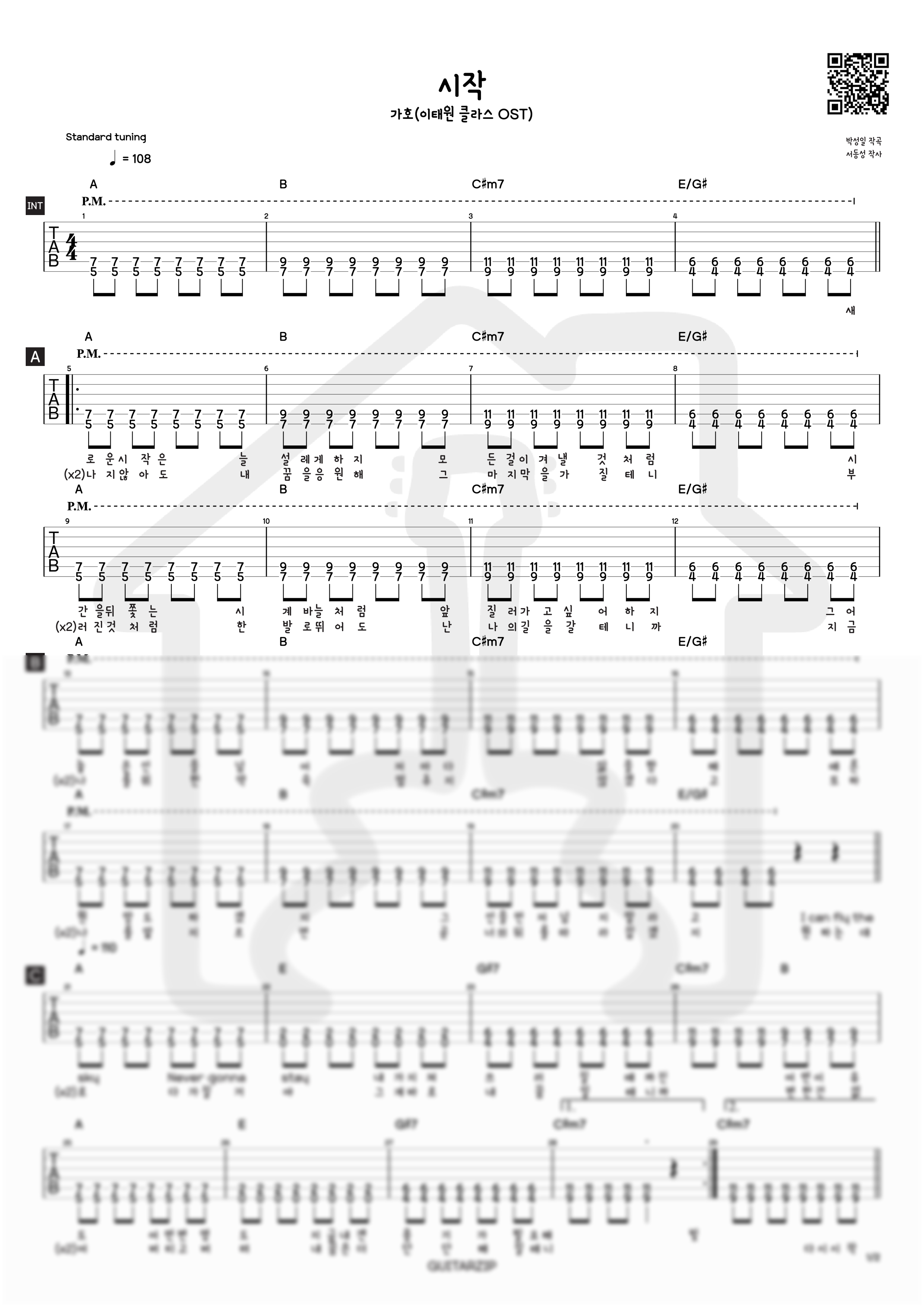 시작 - 가호(Gaho) [TAB] Electric Guitar [★☆☆☆☆] 쉬운 난이도의 악보입니다. 입문자 초심자분들께 적극 추천드립니다 :)